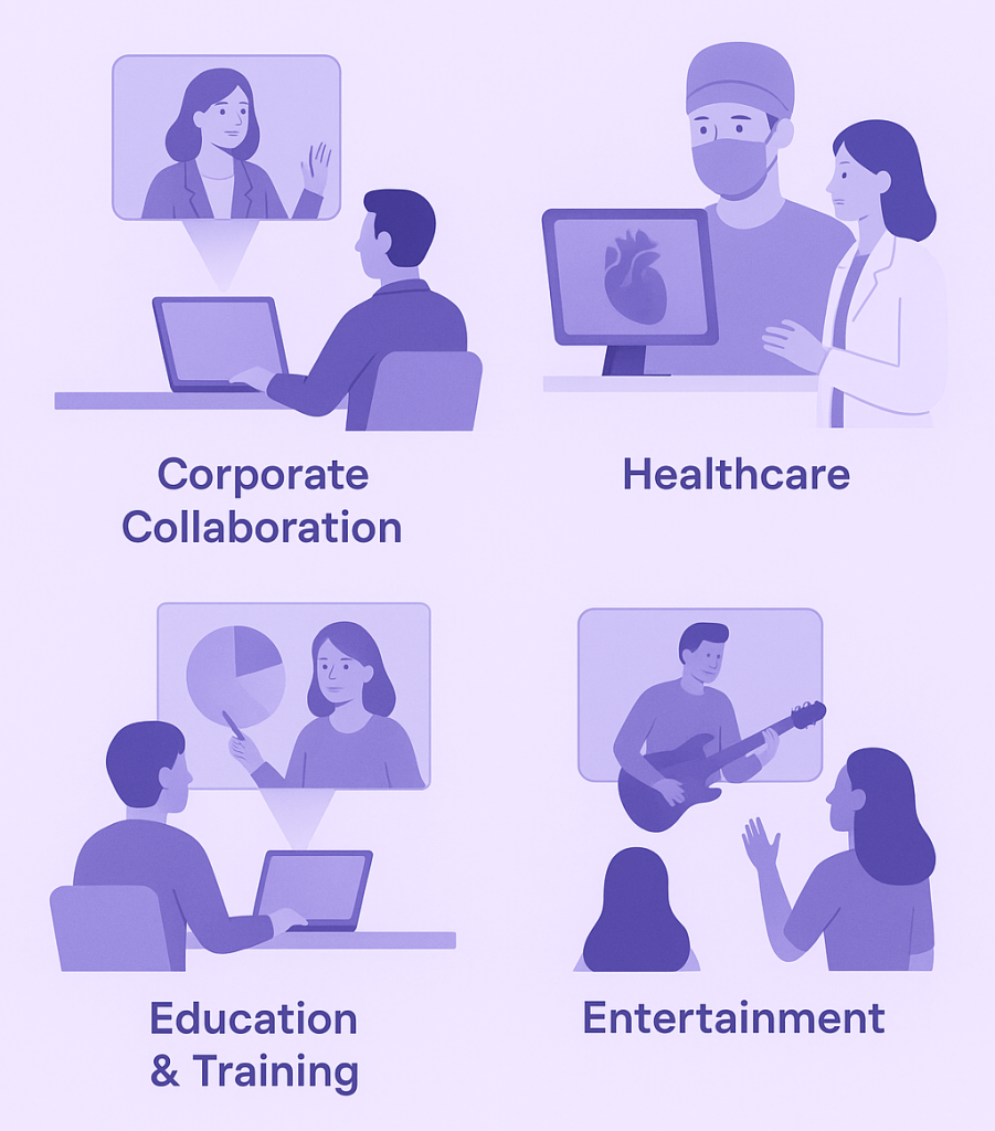 Corporate Collaboration – Boardroom meetings, product launches, and team training in holographic form.
