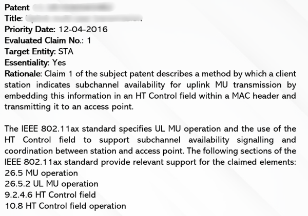 To assess a patent’s essentiality, our technical expert team manually analyses each claim with respect to the Wi-Fi 6 standard to verify that all claim elements are present. We have classified a patent as potentially essential, potentially non-essential, or medium based on the following criteria: